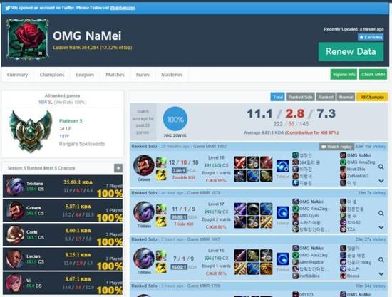 就在昨天我们报道了Uzi恐因伤病问题退役,而今日就有玩家发现娜美的韩服ID已经改为OMG NaMei,并且与Amazing牛头哥双排,段位目前是白金5,16胜0负100%胜率。这不禁让人联想到了是不是OMG已经向所属队伍已经降级了的娜美抛出了橄榄枝?