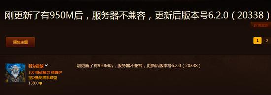 根据玩家的反馈,更新补丁是在半夜时分出现的,如果不进行更新的话无法进入游戏,更新了以后游戏版本会退回到6.2.0版本,并且登陆角色时会显示服务器不兼容,看来是版本回档了。另外,非该时段登陆的用户似乎不受影响。