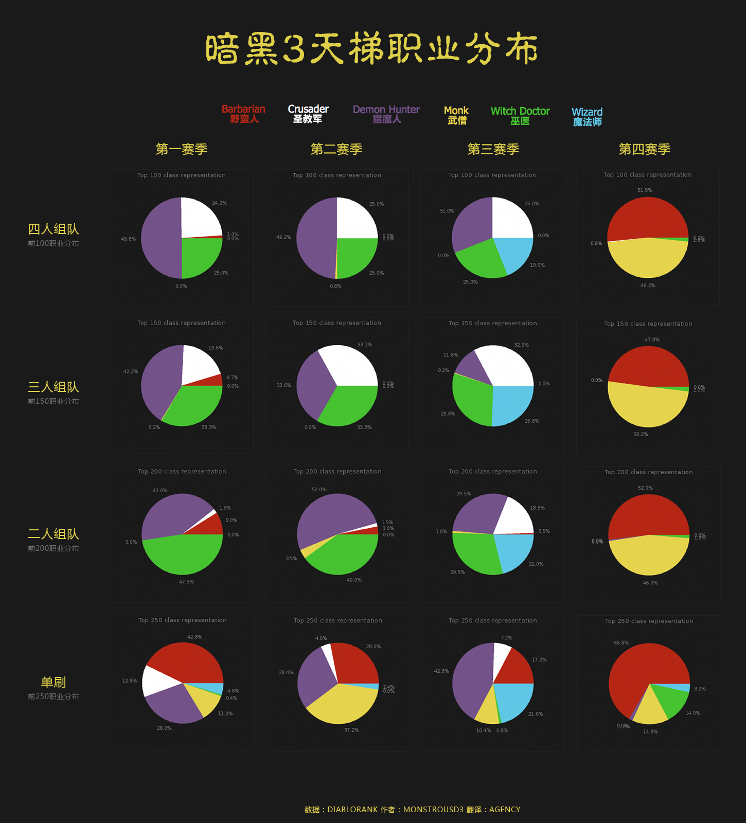 目前天梯上活跃的是哪些职业?很多玩家开口都会说出野蛮人、武僧等等,但过往赛季的情况呢?外站Diablorank发布了一份关于过往赛季天梯职业分布表供我们查看。你还记得当时赛季的职业强度情况吗?数据变化的原因你知道是怎么回事吗?