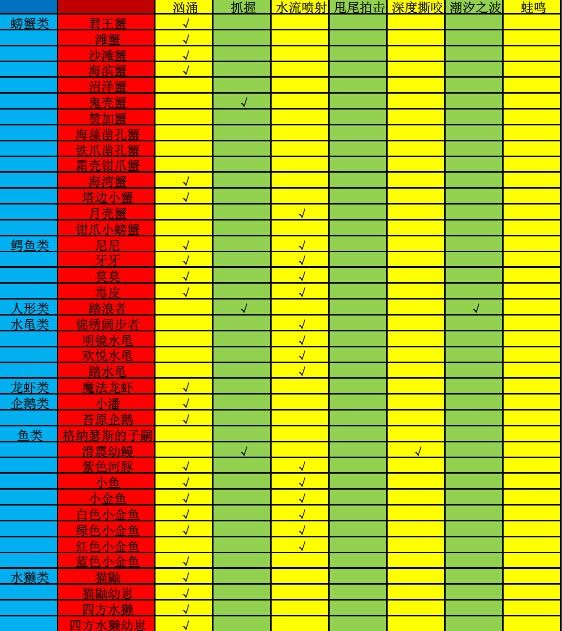 至6.22版本,所有75只水栖类种族战斗宠物所具有的技能,它们将以一定规律横向排列,你将从中得到: