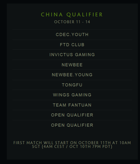 下面为中国赛区预选赛参赛队伍 包括2个公开赛名额 可以说中国赛区还是感觉比较惨烈的 包括IG NB WINGS 饭团战队 FTD等等都要捉对厮杀 比赛时间为10月11日到10月14日 第一场比赛为早上10点开始
