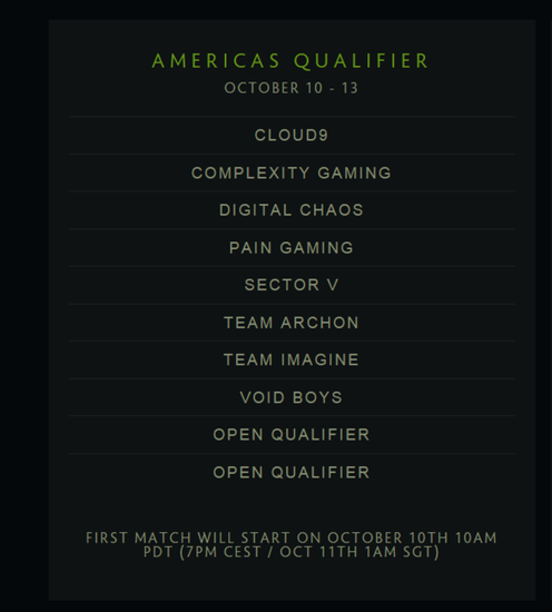 下面为美洲预选赛队伍 还有2个公开预选赛名额 比赛时间为西雅图时间10月10日到10月13日 第一场比赛为西雅图早上10点开始