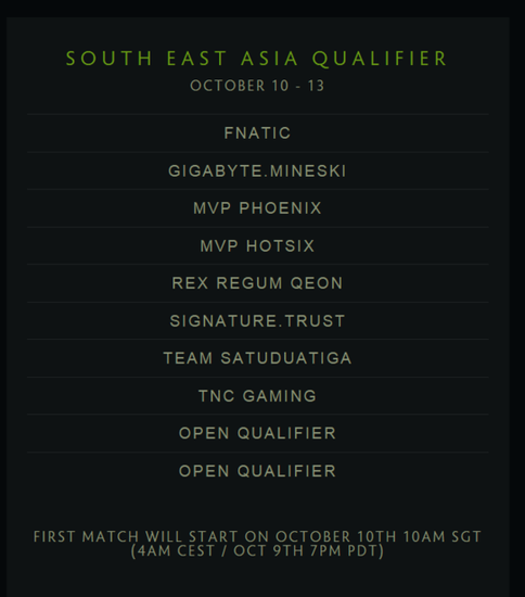 下面为东南亚预选赛参加队伍 由于今年东南亚赛区没有直接邀请 所以有2个参加锦标赛名额 也是有2个公开预选赛名额 比赛时间为当地时间10月10日到10月13日 第一场比赛为当地早上10点开始