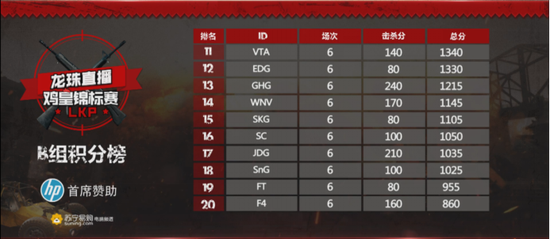 而老牌战队VTA、EDG、wNv、JDG、SNG则很遗憾的和本次比赛告别,被淘汰出局,由知名主播天然呆和前英雄联盟职业神超等选手组成的F4战队,则积分垫底,无缘循环赛。