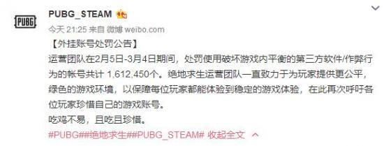 就各位绝地求生玩家最关心的外挂问题传来最新消息,蓝洞官方于3月5日晚通过微博发布外挂账号处罚公告: