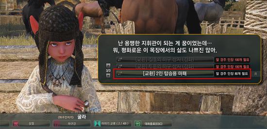 然而,获得双座马并不容易。在于NPC交换坐骑前,玩家需要搜集80张马牌,并学习骑马技巧。当马匹长到6岁时让它学习技能。只有极少的普通马才能学会运送两个角色的能力。