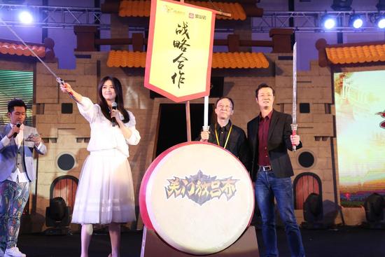 (从左至右:主持人陈汉典,游戏明星代言人蒋欣,A8新媒体集团首席投资官、指游方寸董事长苏蔚,金山云合伙人田开颜)签约现场,双方高层与游戏明星代言人蒋欣、主持人陈汉典一同登台,以拔剑结盟的特别方式完成签约,古典武侠风范油然而生,寓意双方希望共同构建游戏云生态,在游戏这个“江湖”中大展拳脚。双方除了在《关门放吕布》项目上通力合作,还将在基础云服务、游戏评测服务、游戏生态等多个领域展开深度合作。