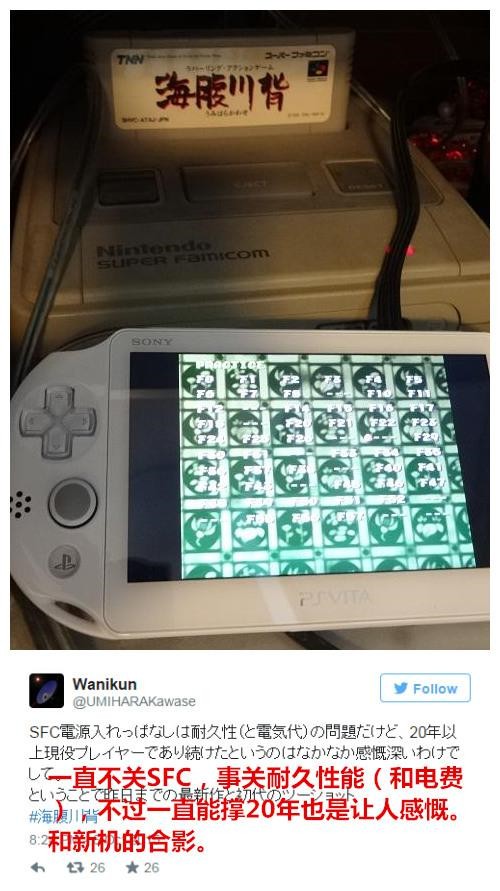 除了要给游戏机的质量点赞以外,20年来只玩这一款游戏,想来小伙也是蛮不容易的……他还给待机时间超长的SNES(SFC在美国的称谓)和索尼PSV来了个合影。