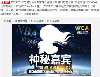 近日,WCA世界电子竞技大赛官方微博爆料,WCA2016“电竞好YOUNG”推荐会将于10月23日在北京798艺术中心召开,届时还将有神秘美女嘉宾现场空降,吊足了大批电竞粉丝的胃口。