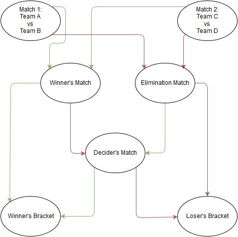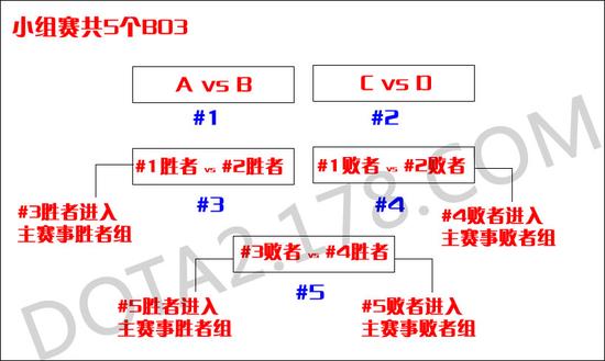 首先小组内俩俩对战,随后第一场比赛取得胜利的队伍将和另一支胜利的队伍对战,连续取得两场比赛胜利的队伍可以直接进入主赛事的胜者组。而连续两场失败的队伍进入败者组。最后剩下的两支队伍进行最后一场较量,胜利的一方进入胜者组,失败的一方则跌落败者组。