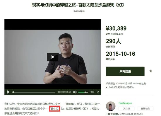 号称国产“最牛X”太阳系沙盒游戏的《幻》于2015年10月16日结束了众筹,最终筹集资金30389元,达到目标3%,众筹宣告失败。