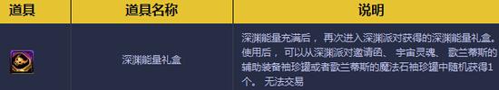2.深渊能量礼盒:活动期间,玩家账号维度挑战深渊派对每消耗一张【深渊派对邀请函】即可提升1点深渊能量,能量条充满的状态下再次进入深渊派对即可获得1个【深渊能量礼盒】