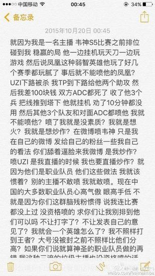 就因为我是一名主播,韦神S5比赛之前排位碰到我,稳赢的局,他一边玩天刀一边玩游戏,然后说凤凰这种弱智英雄他玩了好几个赛季都玩腻了,事后我就不能喷 他的凤凰?UZI下路被杀,我TP到下路给他两个助攻,然后我差100块钱,双方ADC都死了,收了他3个兵,把线推到塔下,他就挂机,劝了10分钟都没 用,然后其他3个队友和对面ADC都喷他,我就不能喷他?喷了我就是没素质?我就是想火?我就是想炒作?在微博喷韦神,只是我在自己的微博,发给自己的粉 丝一些自己的看法,你们舔着逼脸来我微博,是我炒作?喷UZI是我直播的时候,我也要直播炒作?就因为他们是职业队员,他们这些做法,我就该惯着?别的主 播不敢喷,我就敢喷。现在中国的大多数职业队员心高气傲,眼高手低,不就是因为你们这群脑残粉惯得,说我连比赛都没上过,没资格喷的,求你们让我别排到他 们可以吗,不让打字了?不让发表自己的意见了?我就会一个英雄怎么了,我不照样打到王者?