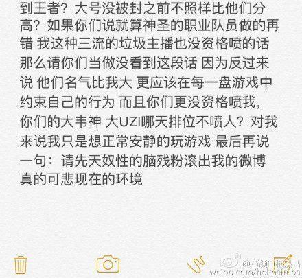 大号没被封之前不照样打到王者?大号没被封之前不照样比他们分高?如果你们说就算神圣的职业队员做的再错,我这种三流的垃圾主播也没资格喷的话,那么请你 们当作没看到这段话,因为反过来说,他们名气比我大,更应该在每一盘游戏中约束自己的行为,而且你们更没资格喷我,你们的大韦神,大Uzi哪天排位不喷 人?对我来说我只是想正常安静的玩游戏,最后再说一句:请先天奴性的脑残粉滚出我的微博,真的可悲现在的环境。