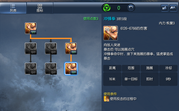 冲锋拳,9秒一次,高伤回内,截拳取消使用,基本是很常用的点穴续航技能,但是要给自己留后路,如果没暴击就交出通背拳不补点穴。顺便说一下这个版本的点穴,基本上就是冲锋拳起手去点,配合灵核BUFF第一下基本是稳的,然后222FF222F4X点上第二层,然后看着BUFF时间大约点穴到6-7秒的时候截拳冲锋点第三层,没暴击就补通背点穴,最后一层冲锋迅火脚点穴,点穴BUFF快结束的时候给通背完了刚好结束给个点穴,基本如此循环,也不需要刻意做控制,而且这种挂点穴方法很稳定。