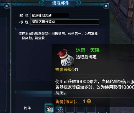 打完还收到一个邮件,说在聚饮排名第一,给了32万修为和300帮贡。