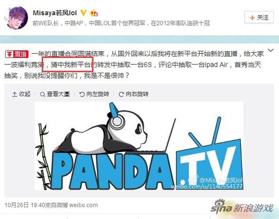 微博原文:“一年的直播合同圆满结束,从国外回来以后我将在新平台开始新的直播,给大家一波福利竞猜,猜中我新平台的转发中抽取一台6S,评论中抽取一台Ipad Air,首秀当天抽奖,别说我没提醒你们,我是不是很帅?”
