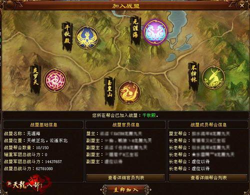 自己所在的战盟情况战盟盟主或副盟主可以用战备点数购买火把、藤甲衣、密道权限和飞行权限。火把可以摧毁城内建筑,藤甲衣可以面议箭塔50%的伤害,密道权限可以直接 把攻城的军队传送到对方城里进行偷袭,飞行权限可以直接把攻城士兵传到城墙上。这些辅助设施与城战的胜负息息相关。玩家一定要认真对待备战阶段,为攻城战 积聚力量。