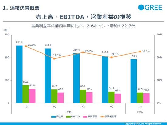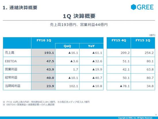 GREE在10月29日公布2016财年第一财季的财报(2015年7月~9月),财报期内营收为193.08亿日元(约合10.17亿元人民币),环比减少16.1%,营业利润为43.85亿日元(约合2.3亿元人民币),环比增加1.7%,经常利润为39.97亿日元(约合2.1亿元人民币),环比减少10.1%,净利润为23.94亿日元(约合1.26亿元人民币),环比增加102.1%,从上一财季的78.1亿日元(约合4.11亿元人民币)的亏损转为盈利。