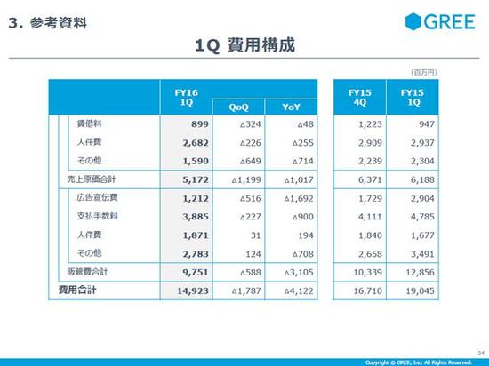 在经费使用方面,与上一财季相比减少了18亿日元为149亿日元。其中广告宣传费方面对大众宣传活动进行了控制,共花费12亿日元,环比减少5亿日元(营收比例:4Q 8.3% → 1Q 6.3%)另外服务器的租借费用也减少3亿日元,加上收购方面折旧费的减少,同样环比减少5亿日元。