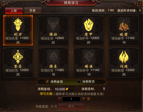 修炼的8个项目升级价格并不相同,盾甲,坚韧,闪避价格比较低。剩余五种修炼价格较高。