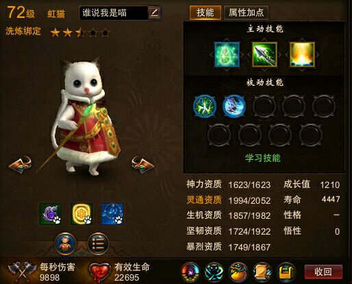 本人平民玩家。虹猫洗了2000元宝没变异就不洗了。2200的灵通还算及格。技能槽开只到5格,所有垃圾技能书都是250战功换的,大概用了30本。