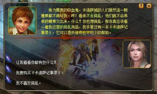 万圣节里怎么可以没有糖果的香甜和捣乱的乐趣?卡诺萨城里的很多居民都预先准备好了各种糖果,不过他们可不会轻易把糖果给你,你要跟他们捣捣乱才行。 在卡诺萨城的街头,你会看到一名陌生的小吸血鬼,他就是捣蛋鬼安东尼。尽管卡诺萨城的人们并不喜欢他,但他每次出手捣乱,总能从大人们那里弄到糖果。你赶紧去找他,看看他有什么绝招吧。