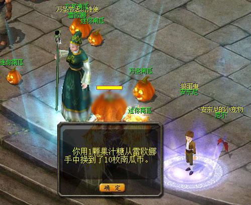 在收获满满的糖果后,你找到万圣节活动特使雷欧娜。在她那里,你可以用糖果兑换到很多的南瓜币哦!