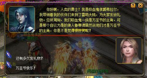 万圣节到了,卡诺萨城里一派节日的欢乐。吸血鬼和狼人们为了证明自己才是万圣节的主 角,他们各自带着自己的鬼怪小伙伴们来到了卡诺萨城。或许这些家伙的模样有些吓人,但它们非但没有恶意,还为雷鸣大陆的勇士们带来了奇异的节日礼物。10 月31日至11月3日期间每日的20:00—20:30,你都有可能在城里碰上这些古怪而友好的家伙们。