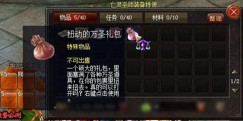 ![]() 扭动的万圣礼包 说明:一个硕大的礼包,里面塞满了各种万圣道具,在你的包裹里扭来扭去。真的可以打开吗?右键点击使用。