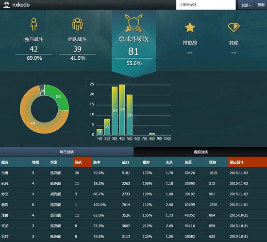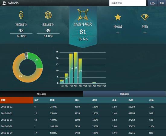 一局的发挥往往不能评判一个玩家的水平,《坦克世界》1200效率的查查开局死也不能说明这个玩家效率是假的,同样战舰世界也是如此,上面的数据是小编的朋友打出来的,通过官方的数据统计不仅能够看到每天的综合战力还能看到玩家的场均击杀,伤害等等,相比下图小编的数据,整体差距明显: