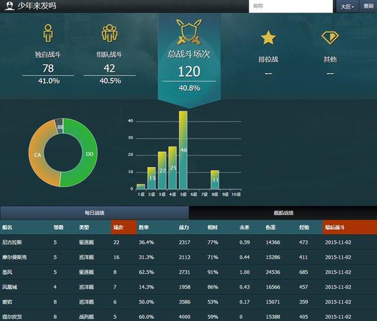 光有当日总体数据肯定不够,数据查询还提供了单体舰船的数据,这和《坦克世界》内置的数据系统很像: