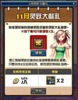 玩家每天首次登录或者物品栏已满时将以邮件提供【11月特别礼物券】,保存期限为1天,请及时收取。