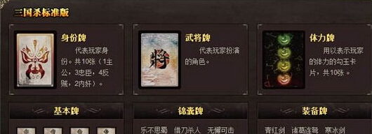 一、首先我们知道三国杀是一款桌游,它是卡牌游戏。主要分为:【身份牌】,【武将牌】,【体力牌】,【基本牌】,【锦囊牌】,【装备牌】。(下面的截图是游戏官网得来,第一幅是标准版。还有军争版对它的补充)