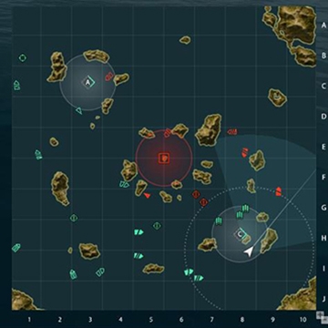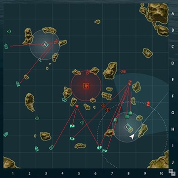 之后如上图,我方虽然让出了B点,但是A点与C点的姿势摆的十分舒服(说法好污),这两点已是囊中之物。对方G9的巡洋舰一看不对,扭头便走,E8的一艘战列舰来不及转向逃走正在被我方集火,对方G5的驱逐舰在我方巡洋舰的围剿下,处境艰难。注意H5的巡洋舰位置,既可以攻击G5的敌方驱逐舰,也可以为I5的战列舰预警鱼雷(一排鱼类巡洋舰好躲,战列舰过于笨重不好躲),还可以在未来C点发生空战时及时赶到提供防空支援。