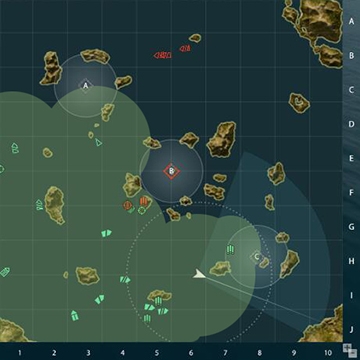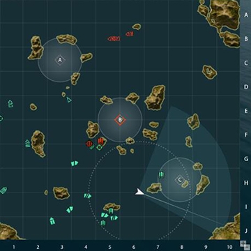 如上图黎明战役,制海权模式。开局我方两个驱逐舰开局分别抢占D3与I7两个区域,中间的盲点由我方的战斗机去补位,两搜巡洋舰则站在E1、J6接应,战列舰则横列在F2-I5斜线上。此时我方的视野控制如下图: