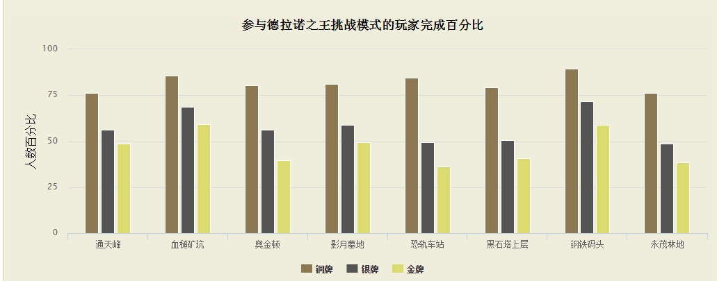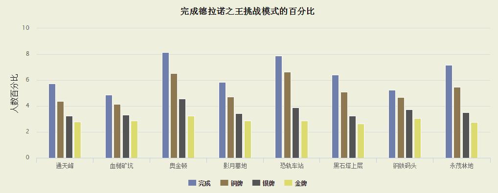 从参与玩家的黄金挑战来看的话,血槌矿坑为最高,通关了该地下城挑战模式的玩家有近6成达成了黄金,最低的为恐轨车站,只有1/3多一些。