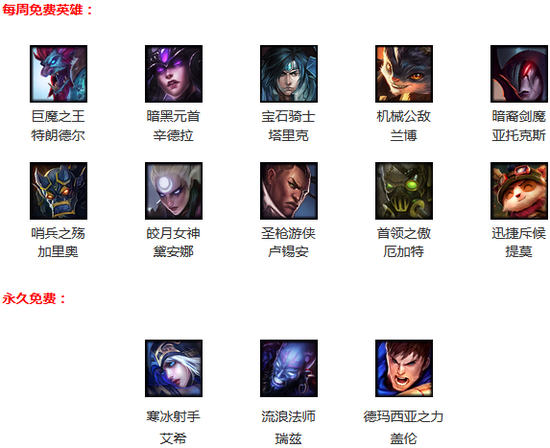 另外,在中国的服务器中,我们额外增加了三个永久免费的英雄——寒冰射手艾希、德玛西亚之力盖伦和流浪法师瑞兹。这三个英雄是永久免费供所有玩家使用的。主要目的也是便于那些刚刚打完新手实战训练营的玩家能够至少有一个自己会用的英雄。