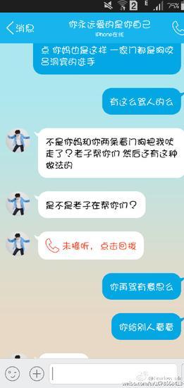 我妈来上海本来是想来了解情况的,她知道我一直给他花钱,给他租房子,但是我一直没说他特么对我打骂,砸我手机的事儿。我妈也不傻,看到我手机那样就知道肯定不是我不小心摔的。不过他当着我母亲的面还nm勇于承认了是他砸的我手机,而他对此仅仅只是一句他生气了没控制住,这么多事儿加在一起哪个父母不心疼自己孩子?我妈就说了他几句,大概就是问他为什么从来不管自己女朋友缺不缺钱,为什么心安理得花钱,知不知道我是学生每个月家里给的生活费和攒这么多年偶尔打工的钱都得来不易。 我特么当时还跟撒比是的护着他,跟我妈妈说你别怪他,他事业刚起步没多久,他对我还是可以的。我妈火了,问我他给你买过什么,你看他现在背的包还是你给他买的,他问过你冷不冷饿不饿么。他在旁边直接发火,跟我妈拍桌子大喊,说什么我妈妈倚老卖老,不了解他就这么说他。 后来我把他拉出去了,第二天我和我母亲就回家了,结果他开始跟我发消息骂我父母,还给我爸爸发短信出言不逊。最过分的就是,说我们全家都是卖淫的,所以有钱,说我可能是被我父母逼着卖淫的,但是他可以接受,这种p话,其他的带sabi 狗这种字眼的多了去了。我跟他说有火冲我发别带上我父母,父母只是心疼我并没有对你怎么样。如果你能多主动看我几次,偶尔在金钱方平等一下,我爸妈也是能看到的就不会觉得你不好了。他更火了,还跟我说你选他们就滚蛋,说如果我用刀威胁父母他们肯定害后怕同意我跟他在一起。我当时真是被他气得想报警了草,我特么也是懦弱当时还劝他消气我真是尼玛窝囊。我现在才懂,就是因为我父母觉得他会对我不好,不一定能给我幸福,他曲解成我父母觉得他没钱没势力,所以就恶言相加的对我和我父母。你们说我玩心机也好我无所谓,我对这个圈子没兴趣,就是想看看事实说出来到底他有没有点羞耻心。
