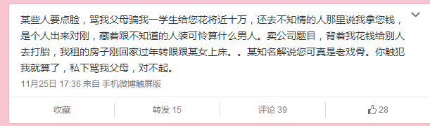 SDN前女友的首条爆料微博,信息量非常大:吃软饭、虚伪、卖公司题目、出轨并致怀孕、骂前女友父母……