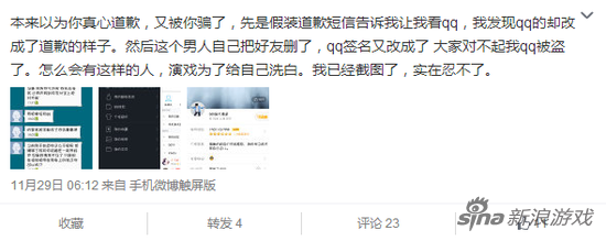 在女方发出上条爆料微博后,SDN并未否认,可见确有其事,女方又发微博称SDN后来向她公开道歉,但道歉前先把QQ好友删光然后声称QQ被盗: