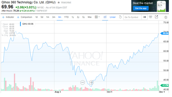 在奇虎360私有化要约消息公布之际,中国股市当时正开始行进在大幅下挫的路途上。受国内股市暴跌拖累,奇虎360股价在9月一度跌破45美元,因为投资者担心潜在买家会失去收购奇虎360的兴趣。当时《华尔街日报》援引一名知情人士消息称,提议将奇虎360进行私有化的投资财团目前考虑下调其90亿美元的出价。