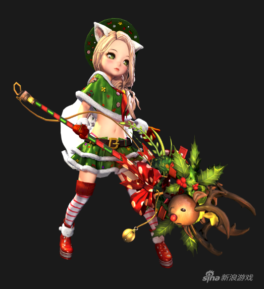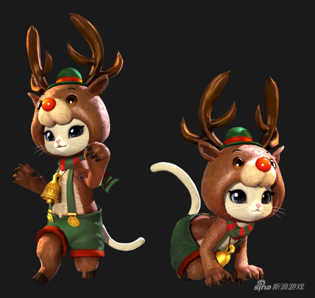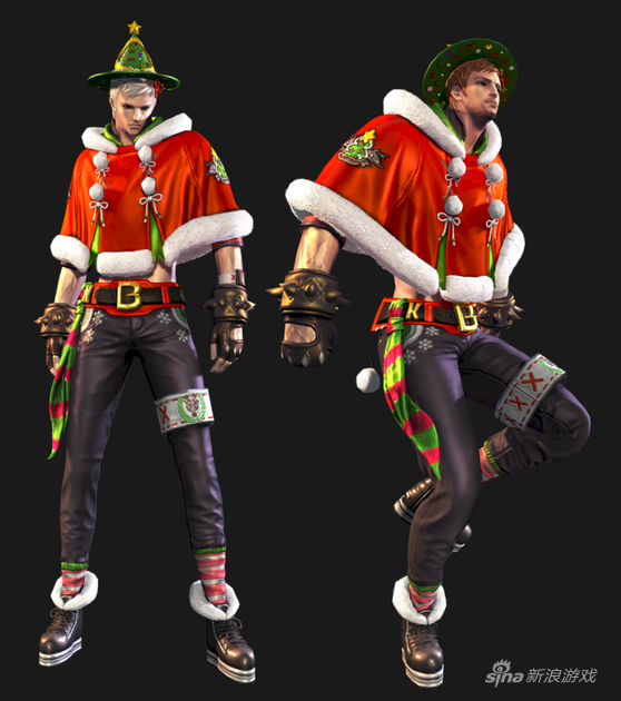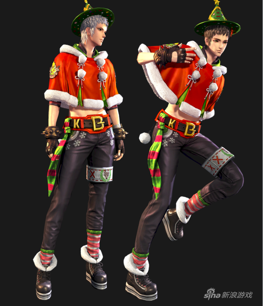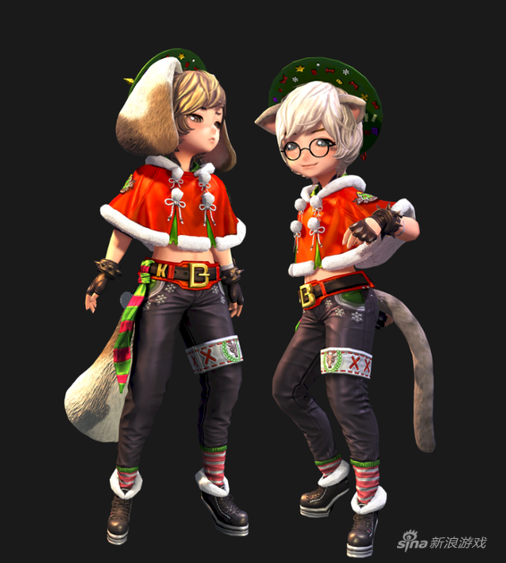 12月的冬季自然少不了圣诞元素,所以在这3款时装中,圣诞装颇具节日气氛。圣诞装采用男红女绿的传统颜色风格,男性圣诞装采用红色斗篷披肩和黑色劲裤,搭配黑色手套和韩版棉靴。女性圣诞装则是绿色斗篷披肩和绿色短裙,套装装饰有星星、蝴蝶结等圣诞礼物元素,搭配红白相间的棉袜与红色高跟靴。另外,召唤兽此次有一款专属的麋鹿时装。