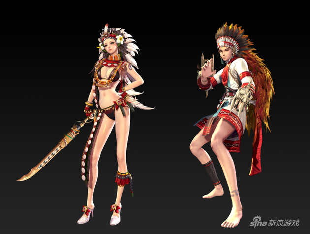 再来看看这款充满异域风情的民族时装,头饰为夸张的羽毛头饰,颈饰为象征民族特色的项链,类似比基尼的女性时装显得尤为性感,而男性时装则比较保守,整体拥有浓厚的民族气息,具有印第安时装韵味。