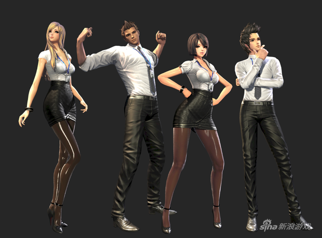 最后一款职业装,女性时装除了高雅之外也很性感,大V领、高腰裙、黑丝袜,上班族日常搭配,男性时装比较传统,白色衬衫、黑色西装裤、皮鞋、领带,另外这款时装有个小细节是配有员工卡,与现实生活极为贴近。