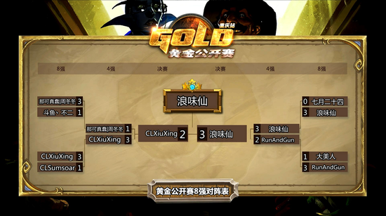 12月6日,《炉石传说》黄金公开赛重庆站的比赛落幕,前中国代表队成员浪味仙夺冠,CLXiuxing获得亚军,这也是CL战队成员连续第三站获得亚军,周冬冬和名将RunAndGun分获3、4名,第四次进入公开赛八强的斗鱼丨不二和CLSumsoar、七月二十四、大美人列5-8名。