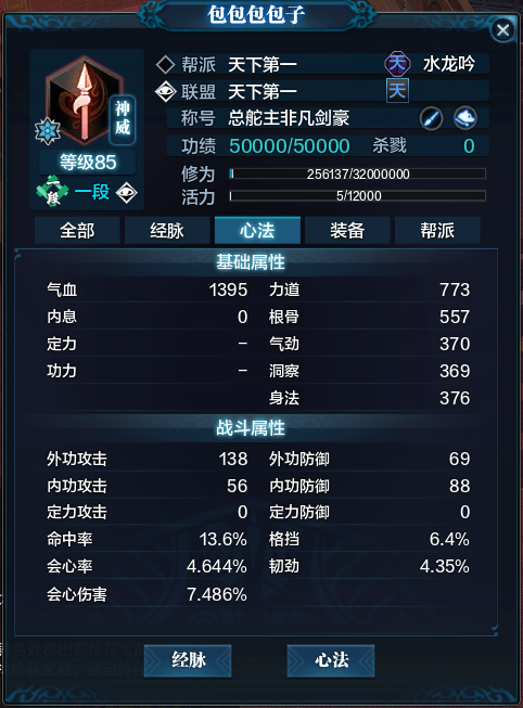 心法目前是提升功力最长远的方法,我的装备,附魔都没有紫的,但是我的5围爆表,而且功力也很高,因为没换附魔,没刷帮贡,提升空间还有400-500点。