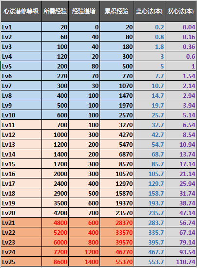 3。 心法潜修的等级目前并没有确认上限,我最高看到了25级的。
