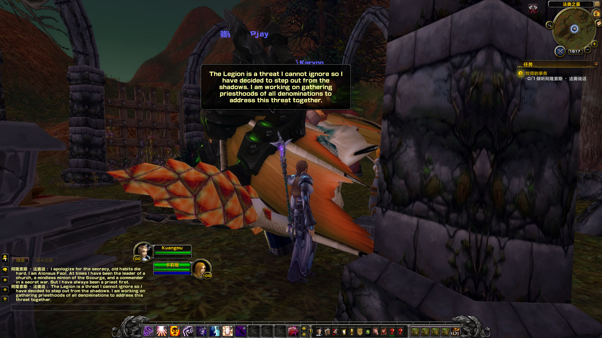 然后这个亡灵牧师就开始忽悠你了,现在面临新的威胁,我们需要一名新的临时工,虽然我知道你很强大是个英雄但你还是得证明给我看巴拉巴拉之类的,说完废话后他就会指引你前往埋藏神器的的地点,提尔之陨。