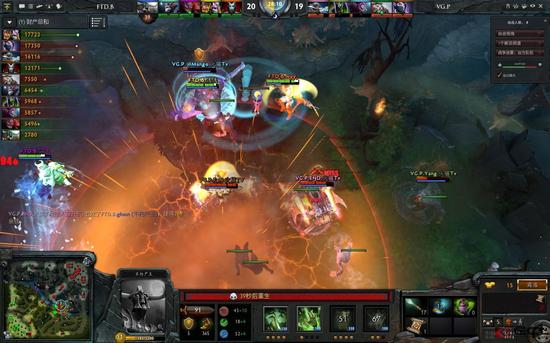 双方肉山一波团战,鱼人跳踩先手,但是尸王的墓碑没有立在高台,很快被飞机开散弹打掉,但是女王的大招在狭小的地形打出了很高的输出,女王三杀,VGP方暗灭圣堂也切掉天辉方的后排,最终双方一波4换4,女王和圣堂存活。